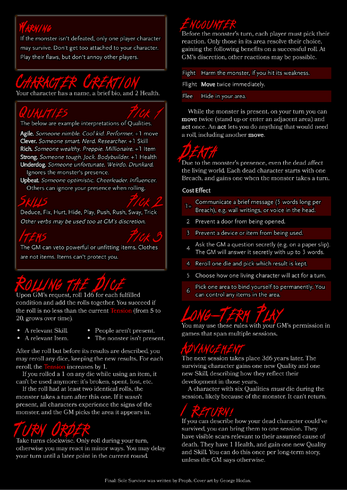 | Tags | Dice, Horror, One-page, Slasher, supernatural, Survival Horror, Tabletop, Tabletop role-playing game |