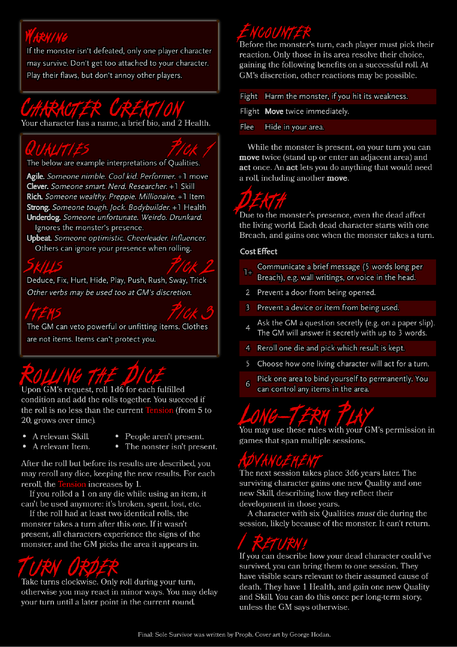 Final: Sole Survivor is a horror-themed tabletop role-playing game for a group of players. Your characters are in an isolated location, pursued by a supernatural monster that's killing them one after another. Use a combination of your qualities, skills, and equipment to figure out how to stop it before it's too late. The second page of the ruleset found in its PDF is made up of optional tables, and some minor guidelines on how one could run this game in the long term, but the game is entirely playable with just its first page.