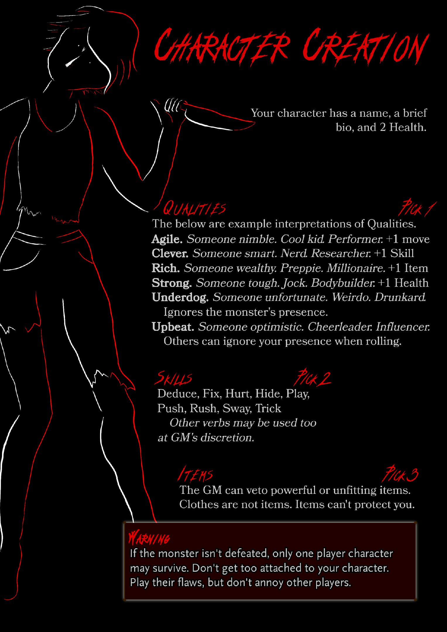 | Tags | Dice, Horror, One-page, Slasher, supernatural, Survival Horror, Tabletop, Tabletop role-playing game |