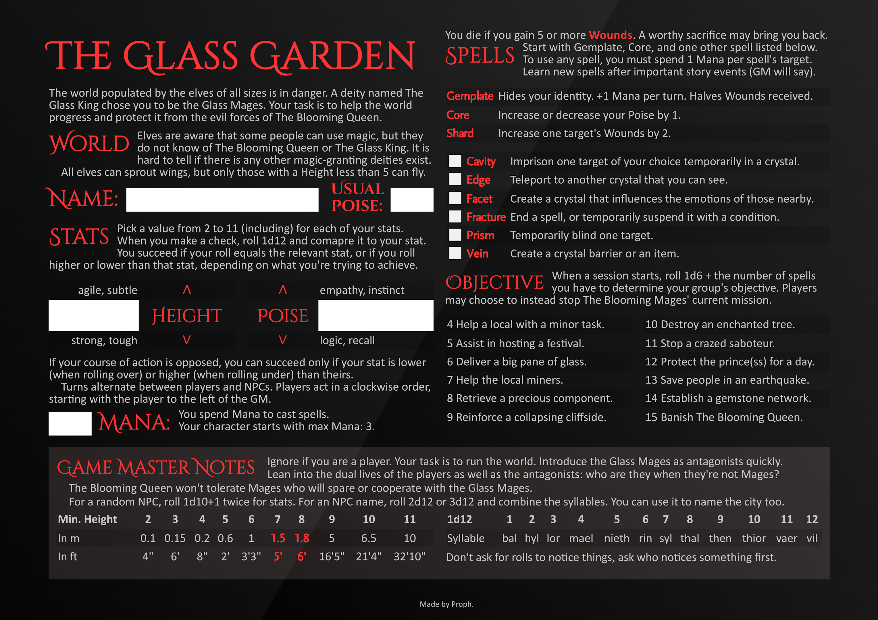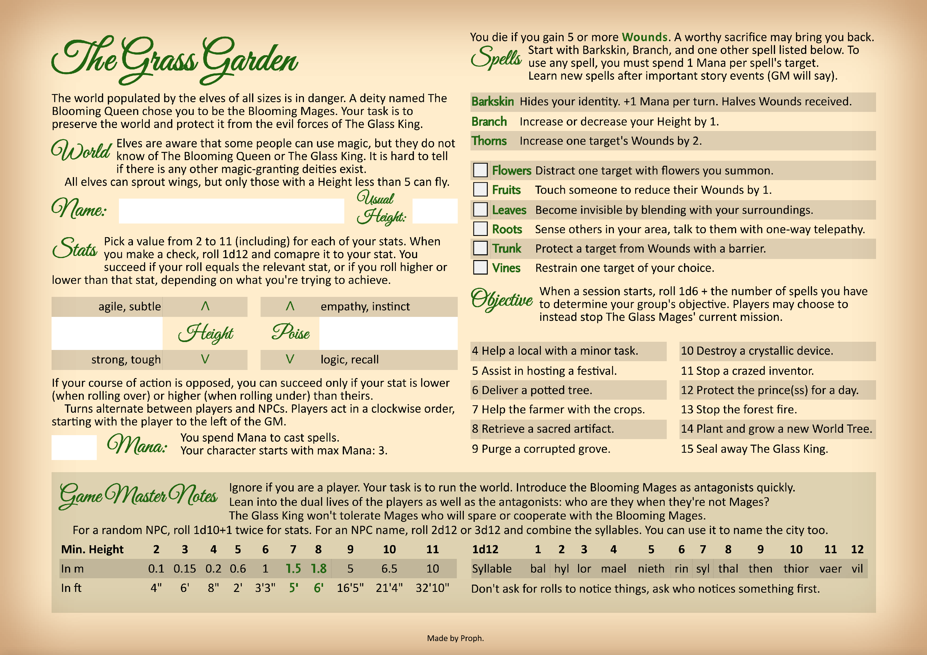 This game is an experiment in several ways. Firstly, it's a spiritual successor to Runehack: Fairy Heist by borrowing its Height mechanic and building on it. Since the theme of this year's One Page RPG Jam was "growth", I decided it might be time to go wacky and make changing height into a game mechanic. At least, that's how it started... by now it's a spell available to one of the character sheets.